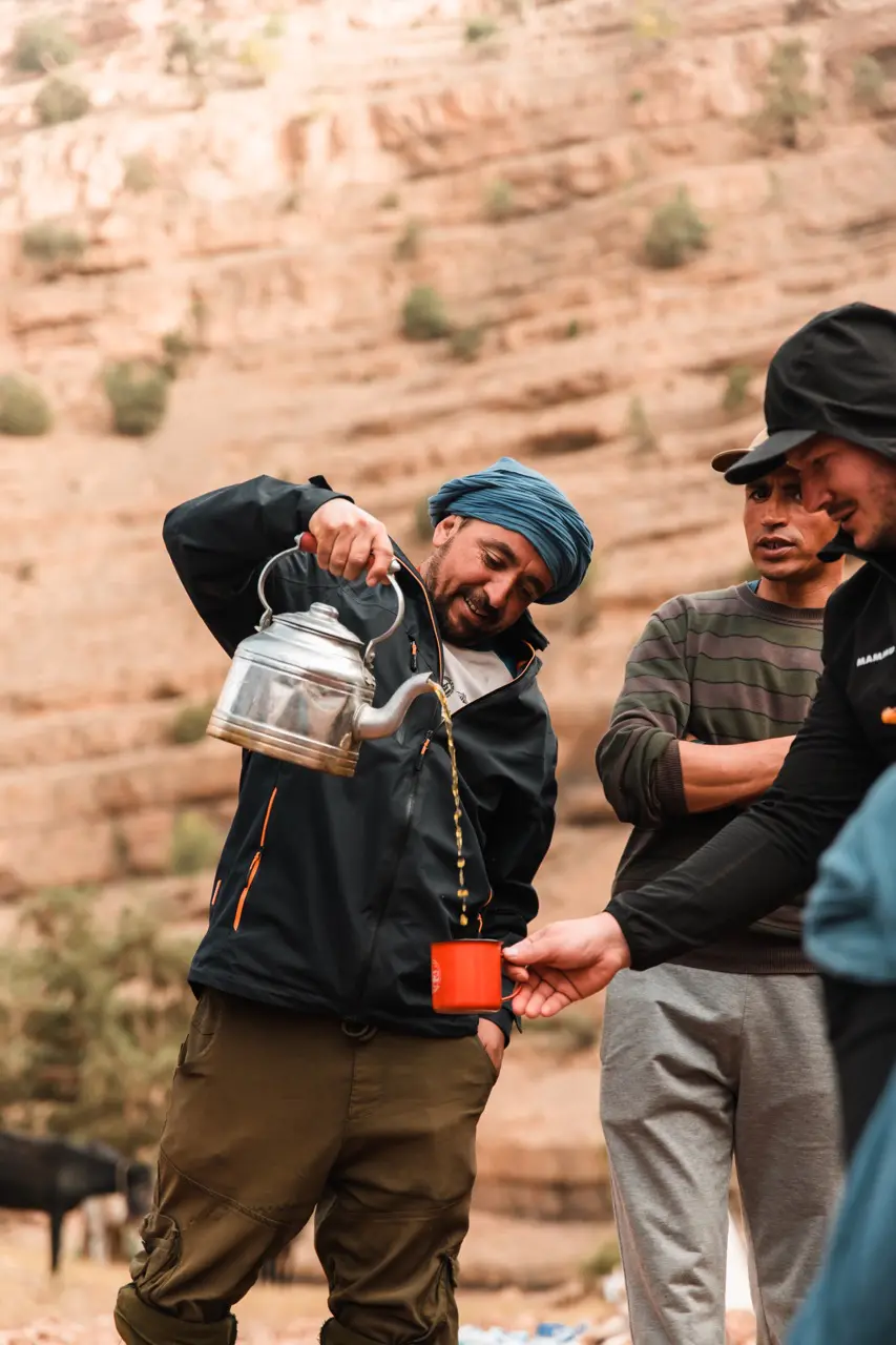 Het traditionele theemoment na elke wandeling is essentieel onderdeel van de dag. Drie glazen muntthee volgens eeuwenoude rituelen, geserveerd met lokale koekjes of dadels. Dit sociale moment hoort bij de authentieke ervaring van The Atlas Trail.